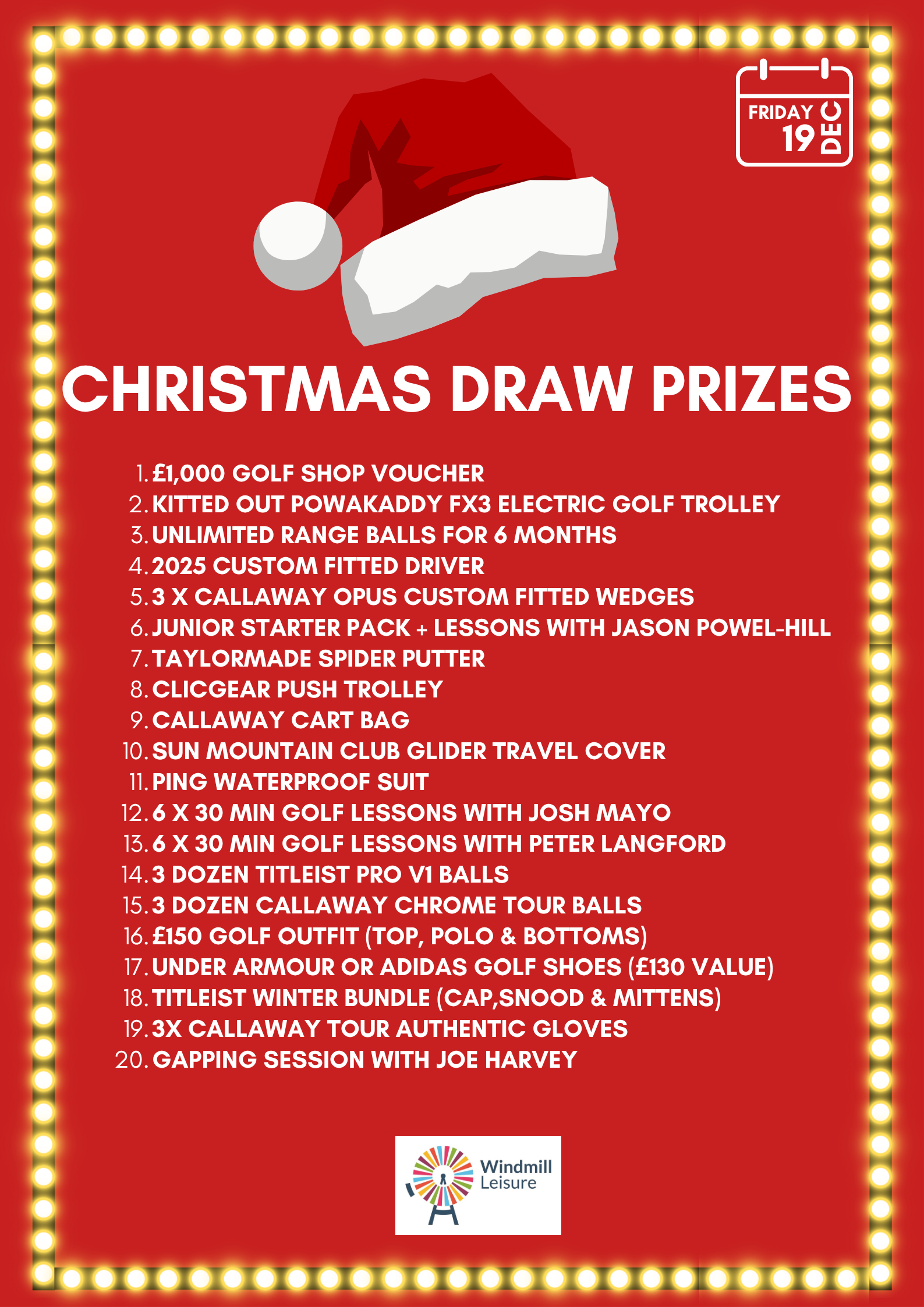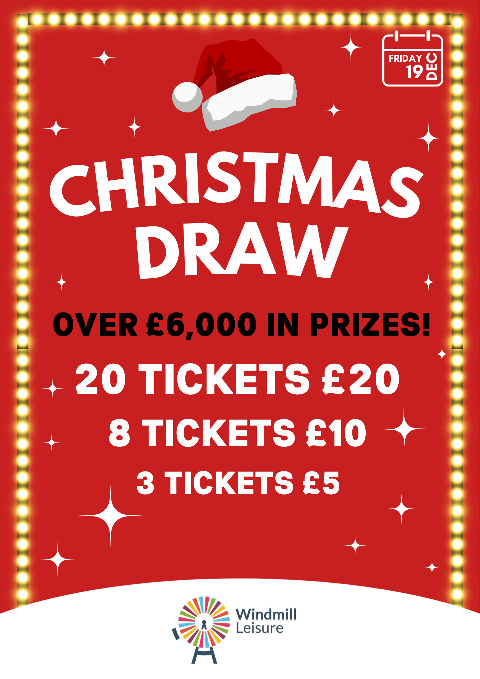 Tickets will be drawn live here at Windmill Leisure on our Christmas Draw Party night, 19th December 8pm